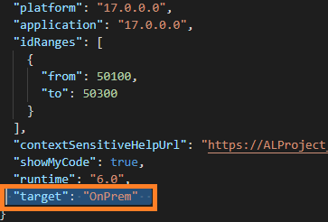 First of all it is necessary to set the target in the app.json file, in this case is target is “OnPrem”